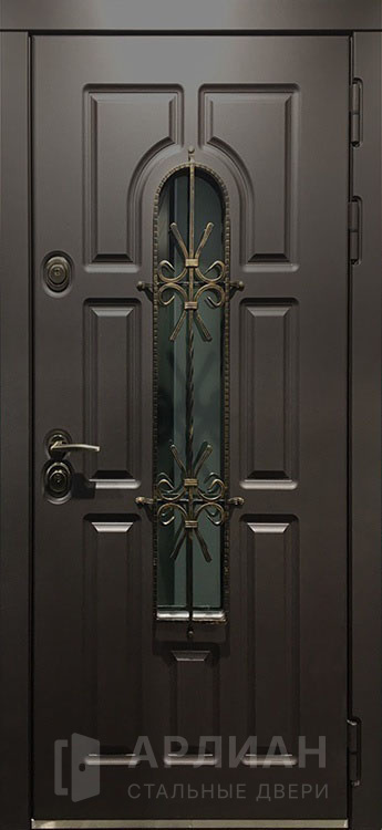 Кованая арочная входная дверь со стеклом и ковкой №69